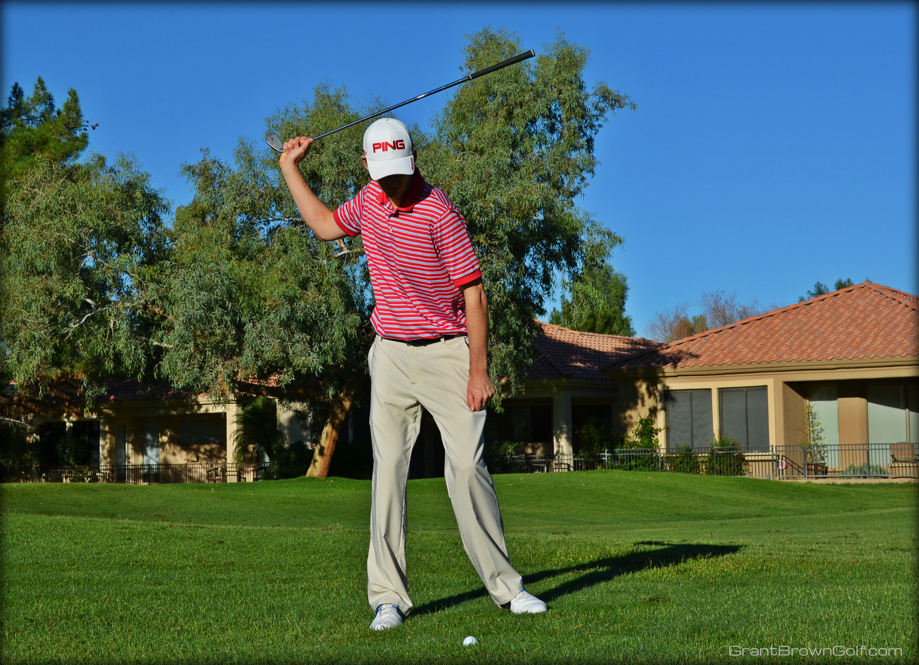 Then, I take a one-handed backswing while letting my arm fold the same way it would if I had two hands on the club.
