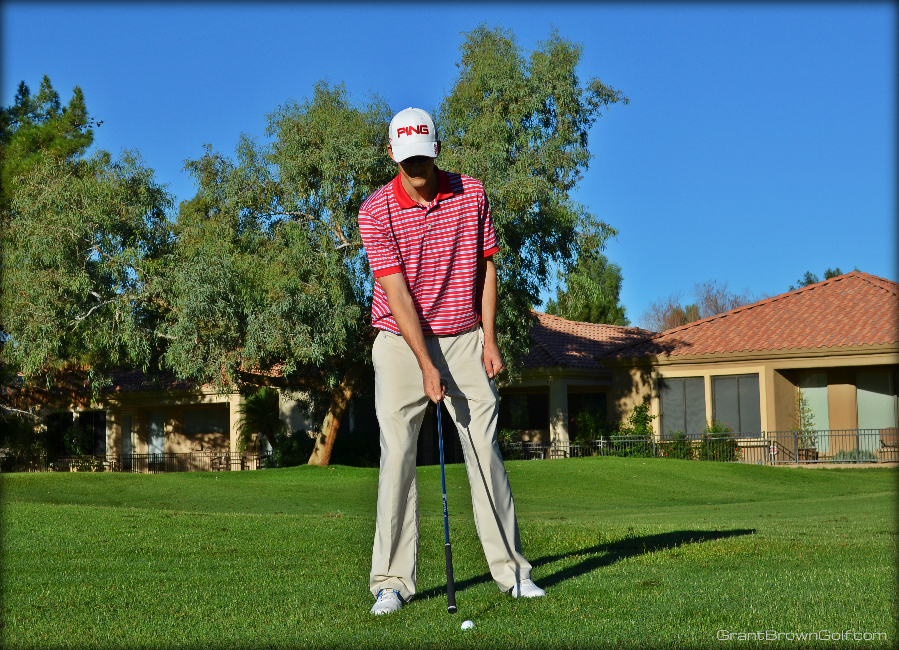 First, I grip the clubhead-end of the shaft with my trailing hand and position my body in my normal set-up posture.