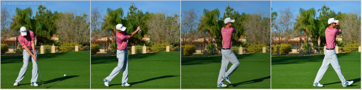 Walk through drill collageIt’s simple to perform, just hit your shot and immediately start walking toward the target as you finish your swing. It will definitely keep you from hanging back on your right side for too long.