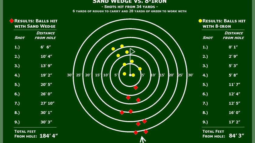 A few days ago, I was giving a lesson to Shannon, a five handicap. From where we were hitting shots, she had 34 yards to the hole. She needed to carry 6 yards of rough and she had 28 yards of green to work with.