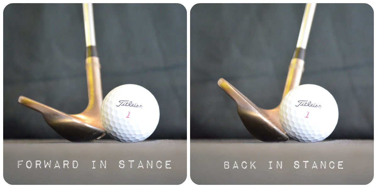 When you correctly play the ball back in your stance off of a hard-pan lie, you will be able to get the leading edge under the ball. Also, the club will not have as much loft at impact and the ball will come out lower with less spin. In the picture below, notice how you are exposing the club-face to the ball instead of the leading edge which will eliminate the bladed shot.