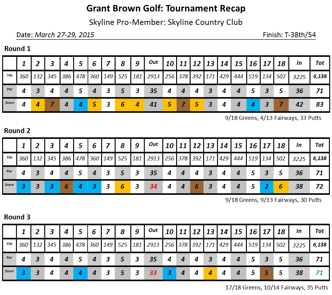 Skyline Country Club is a short, narrow course with small greens that have lots of slope. It’s built on the side of a mountain and almost every hole has out of bounds on each side of the fairway that can come into play. On most of the par 4’s and 5’s the best club to use off of the tee is about a 5-iron. During the first round, I only hit 4 fairways and had 3 balls out of bounds which led to my high score. I’m thankful that I haven’t had to deal with shooting that high of a score in a long time, but I did end up learning a lot from it and was able to come back stronger the last two days.