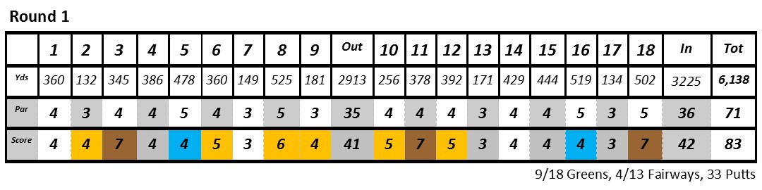 What I learned: When I looked back at my round, I realized I hadn’t been planning a draw or a fade off of every tee and I had been thinking too much about the out-of-bounds. Also, I forgot to restock on water for the back nine. I righted the ship on the last six holes, but I ran out of water on hole number 15 and got really thirsty. On number 18 I made a very bad decision probably due to dehydration. I tried an impossible shot to go for the green in two. I hit that shot out of bounds which led to a double bogey instead of finishing off the round with a par or birdie.