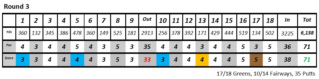 Positives: I feel this tournament showed me a quite a few areas that I needed to address in my game. The best part of my game over the three days was my greenside bunker shots and my shots with pitching wedge from 120 to 130 yards. Also, the third day, I visualized that I was hitting to a flag when hitting my tee shots with my five-iron. This worked really well and helped me forget about the out of bounds; the whole day I didn’t have any balls that even came close to going out of bounds.
