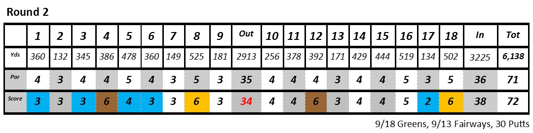 What I learned: After my bad score the first day, I took about an hour the night before the 2nd round to go to a quiet place and visualize and write down my exact plan for every shot for the next day. During this time, I also focused on what I learned from the previous round. I believe this time of planning really helped me remain calm, even when I hit a few shots out of bounds.