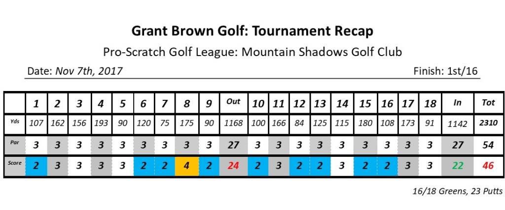 Overview: A perfect day on the course with 75 degree temps and clouds with no wind. Mountain Shadows is a really tricky par 3 course with lots of 2 and 3 tiered greens that make you hit the ball in the correct spots if you want to get a good score. My ball striking and putting was solid with 9 birdies.
