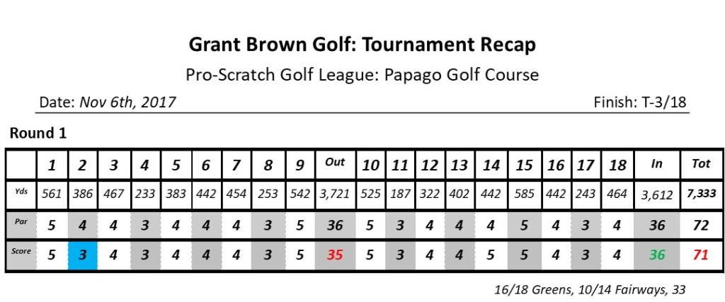 Overview: Another perfect day for golf in AZ. The course was in great condition and it was fun to be back at Papago for the first time in over a year. This was my second round in a row without a bogey. My ball striking was very good with lots of birdie attempts and no 3-putts. Putting was also good, I just didn’t read the putts very well and had a bunch of two-putts. I missed winning by two shots and parring the par 5’s is what really hurt my score today.