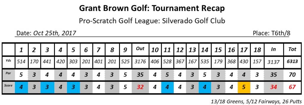 Overview: Great weather and the course was in good shape with the greens rolling really well. I just got new irons, so this was my first round with them and I am happy with their performance, especially the long irons.