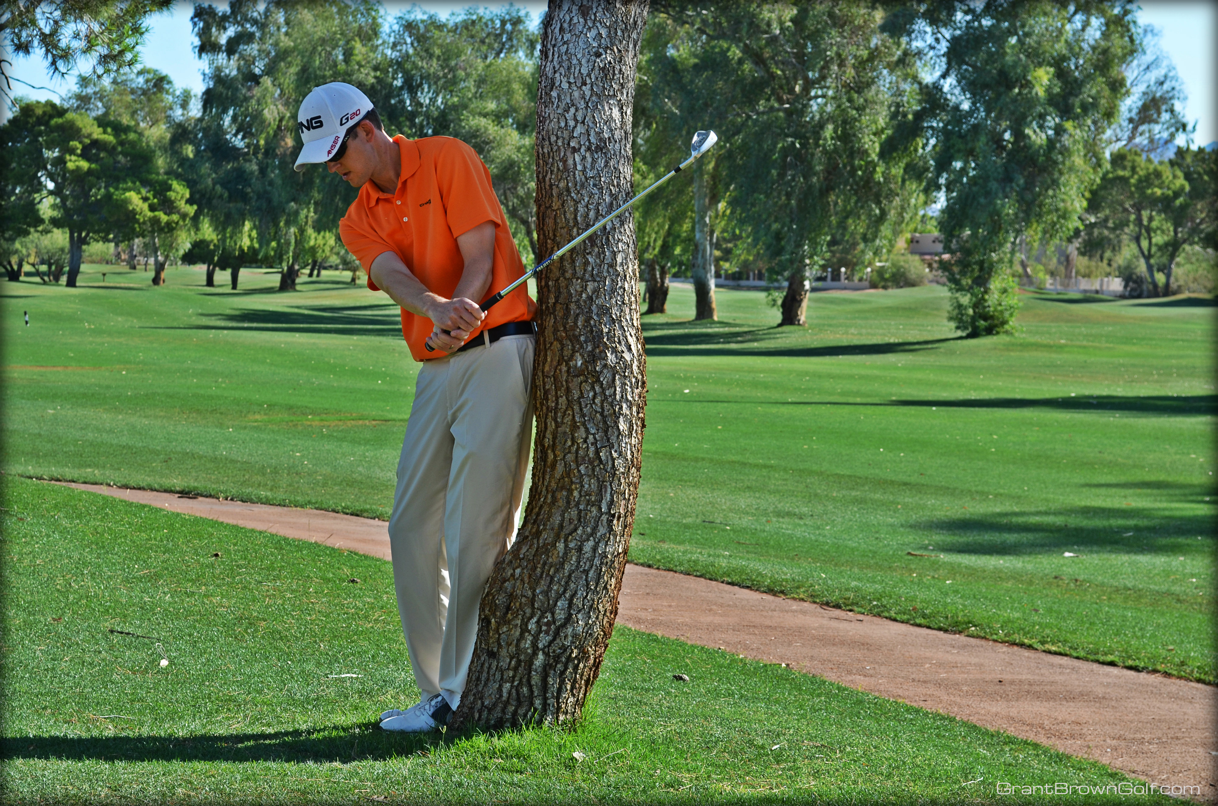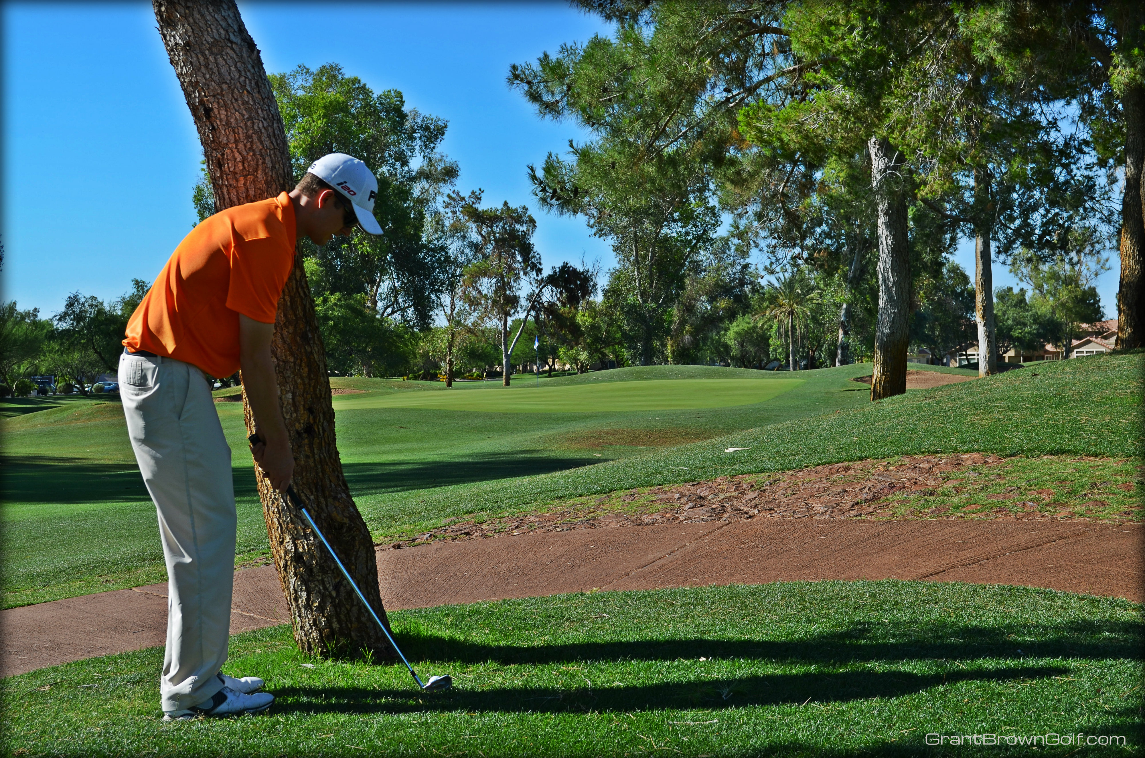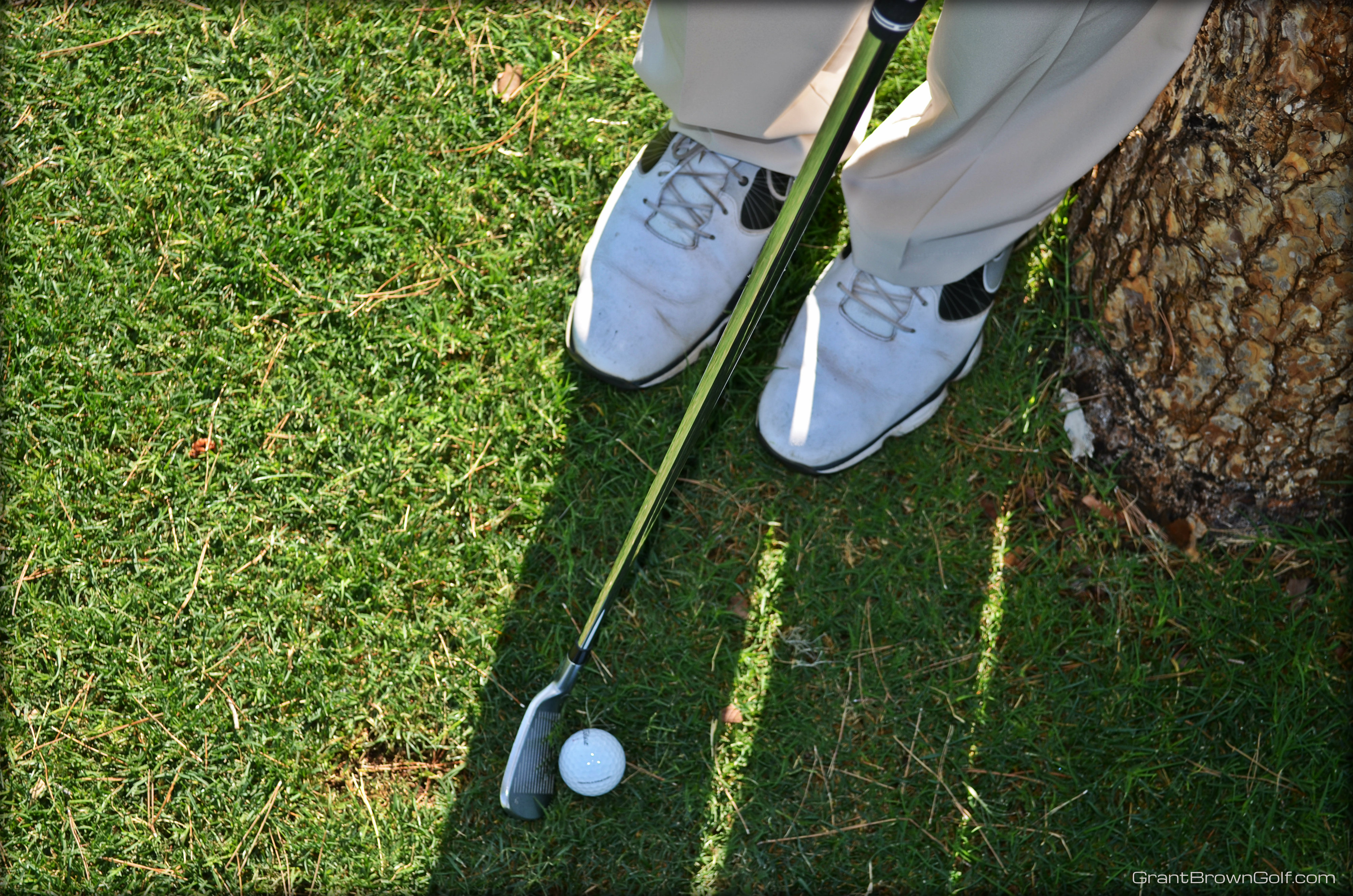 In the past, I used a standard set-up for this shot and would just try to stop my follow through before the shaft of my club hit the tree.
